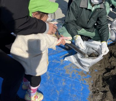 出店ブースを見て写真を撮ったり、土のう作り体験もさせていただきました。