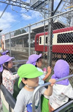 東門前駅から川崎大師駅へぐるっと沿線をお散歩し、時々通る電車に手を振る子どもたち。